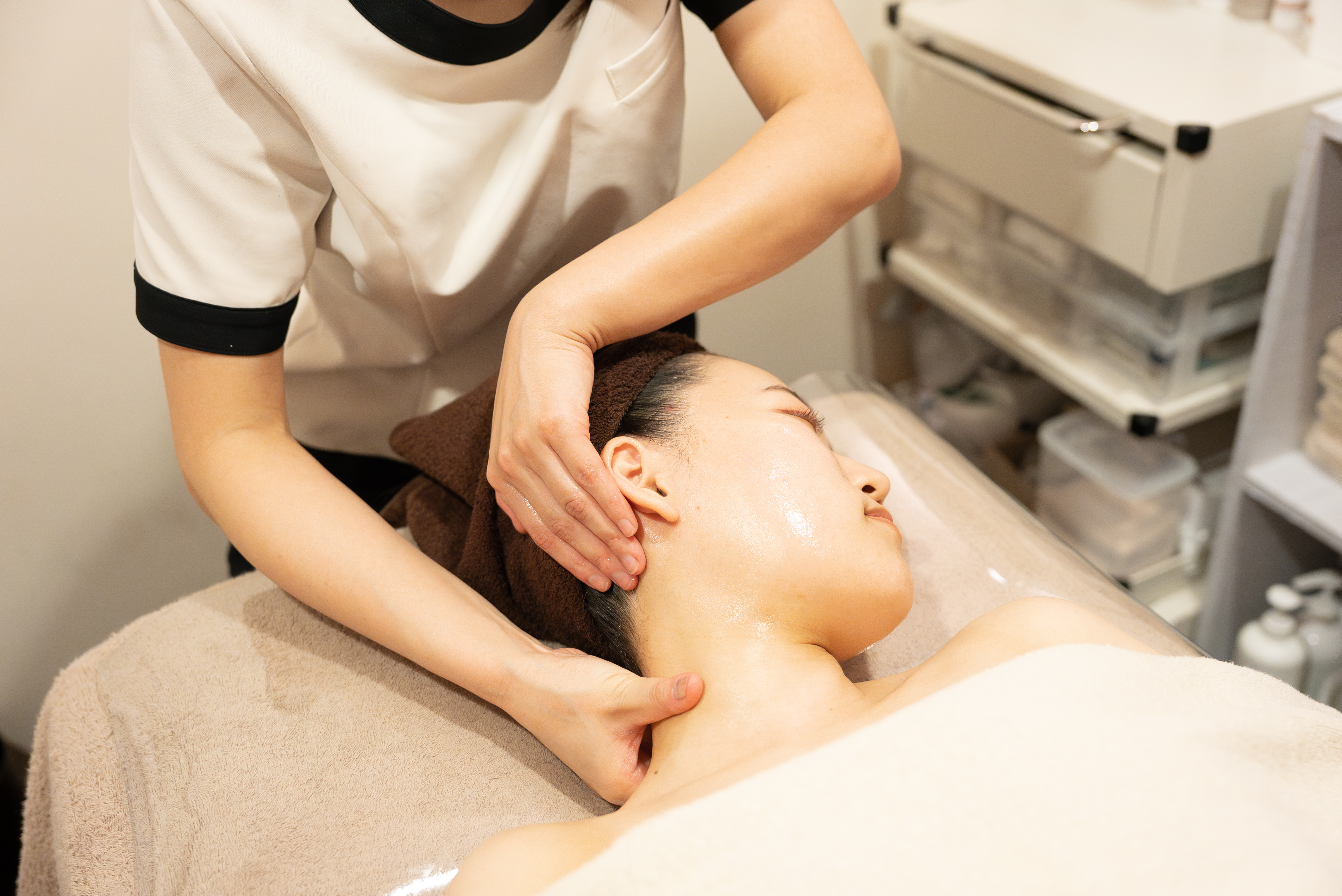 EMSによる表情筋ケアとドクターズコスメでの徹底洗浄・仕上げを。 整骨院ならではの顔・首・肩への本格手技も含まれた満足度高いサービスを。