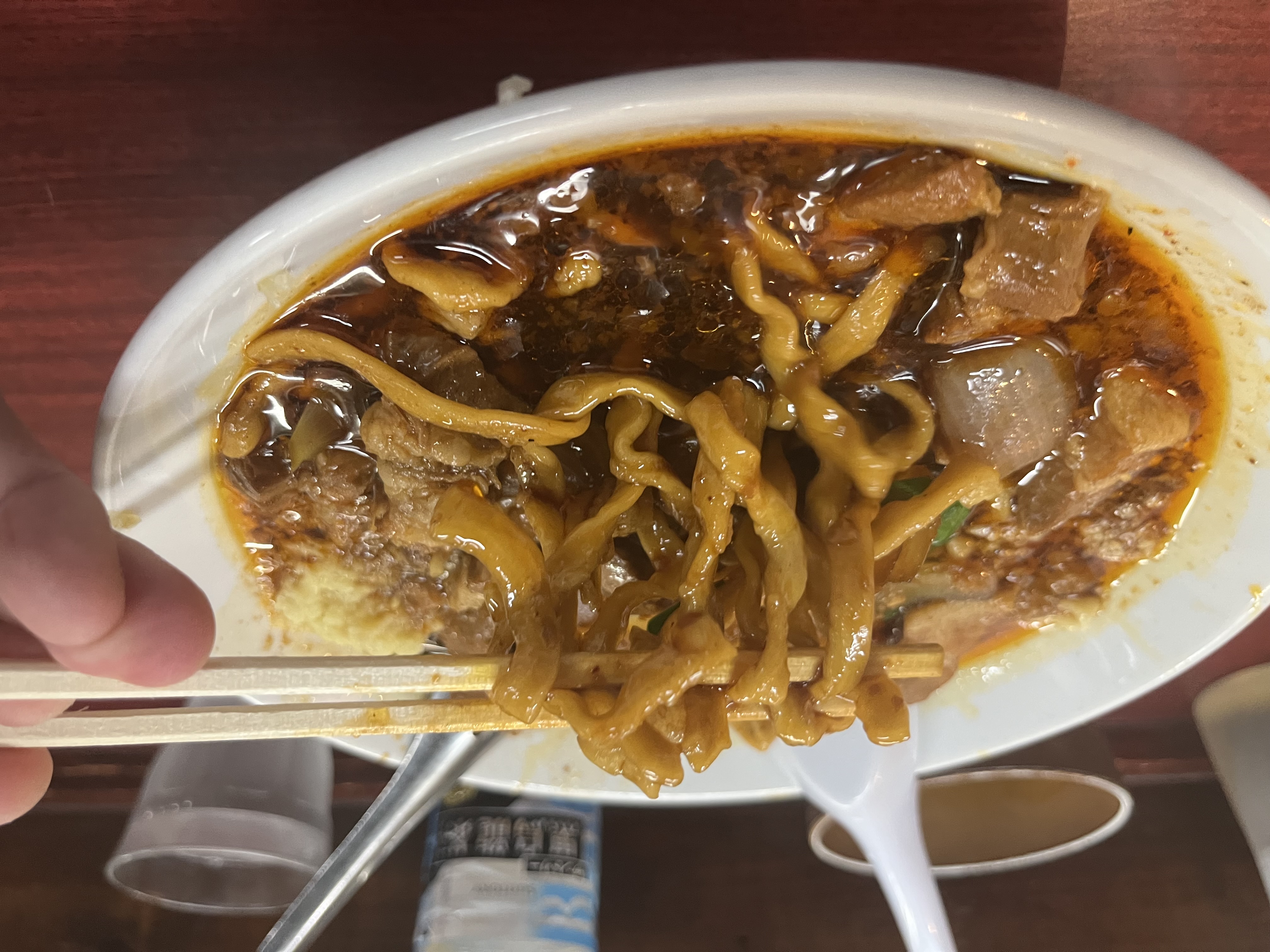 丼を覆うのは豚バラ、玉ねぎ、ニラ。そこへニンニクとショウガ、背脂が加わり、濃厚ながらも不思議と箸が止まらない中毒性がある。麺は力強い極太ストレート。