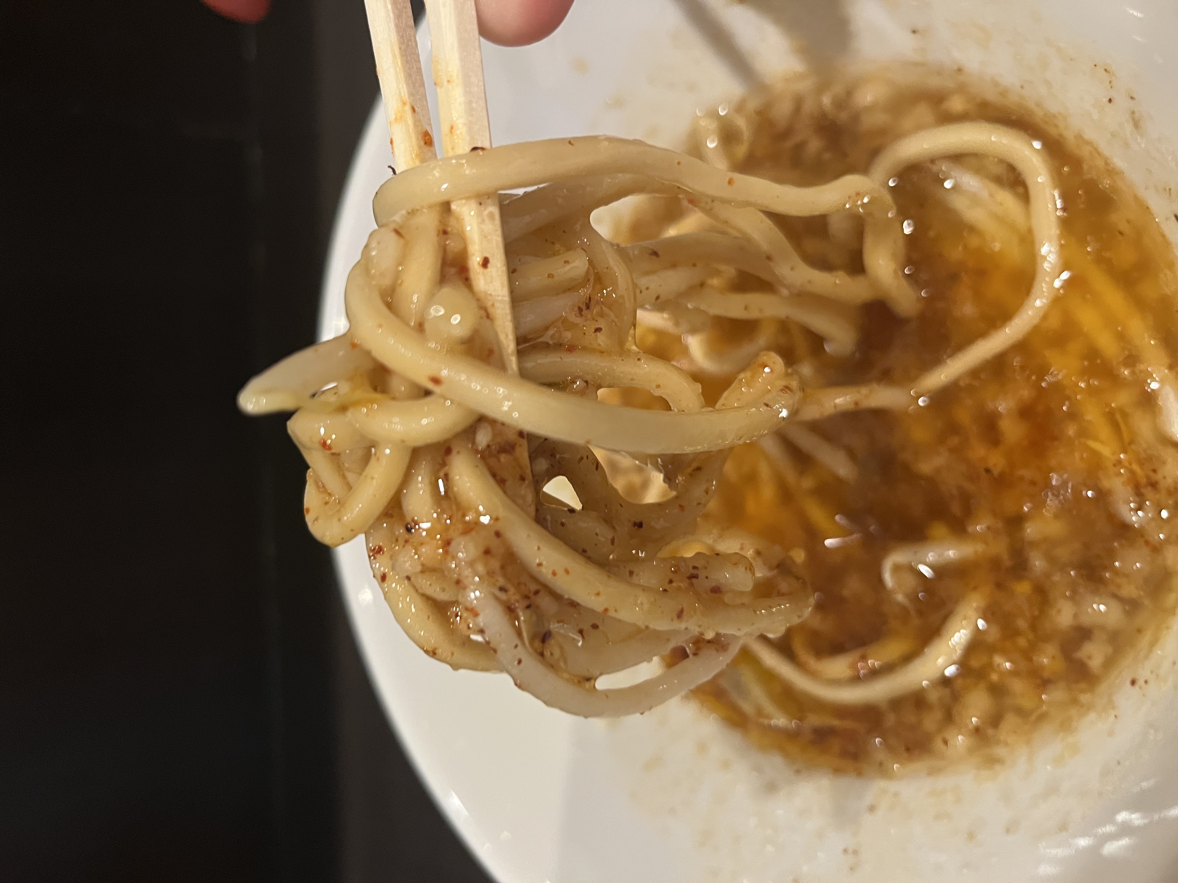 麺を噛むたびに小麦の香りがふわっと広がり、にんにくととうがらしが加わることで味が一気に引き締まり、もう箸が止まりません。