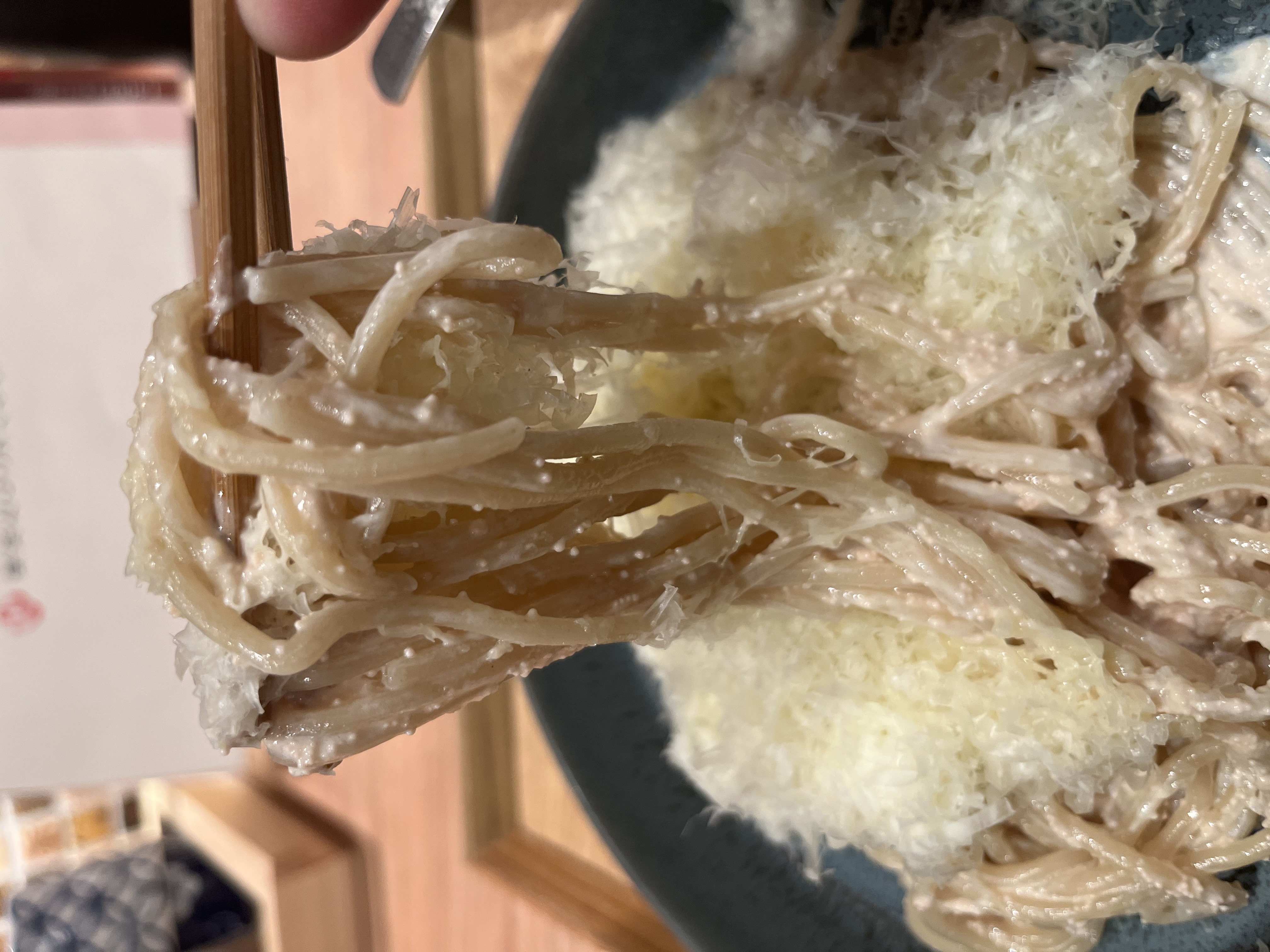 削りたてのチーズは口当たりが軽く、最初はあっさりした印象。しかし、熱々の生パスタと絡み合うにつれてチーズが溶け、たらこの塩味と合わさることで、味わいは一気に濃厚に。
